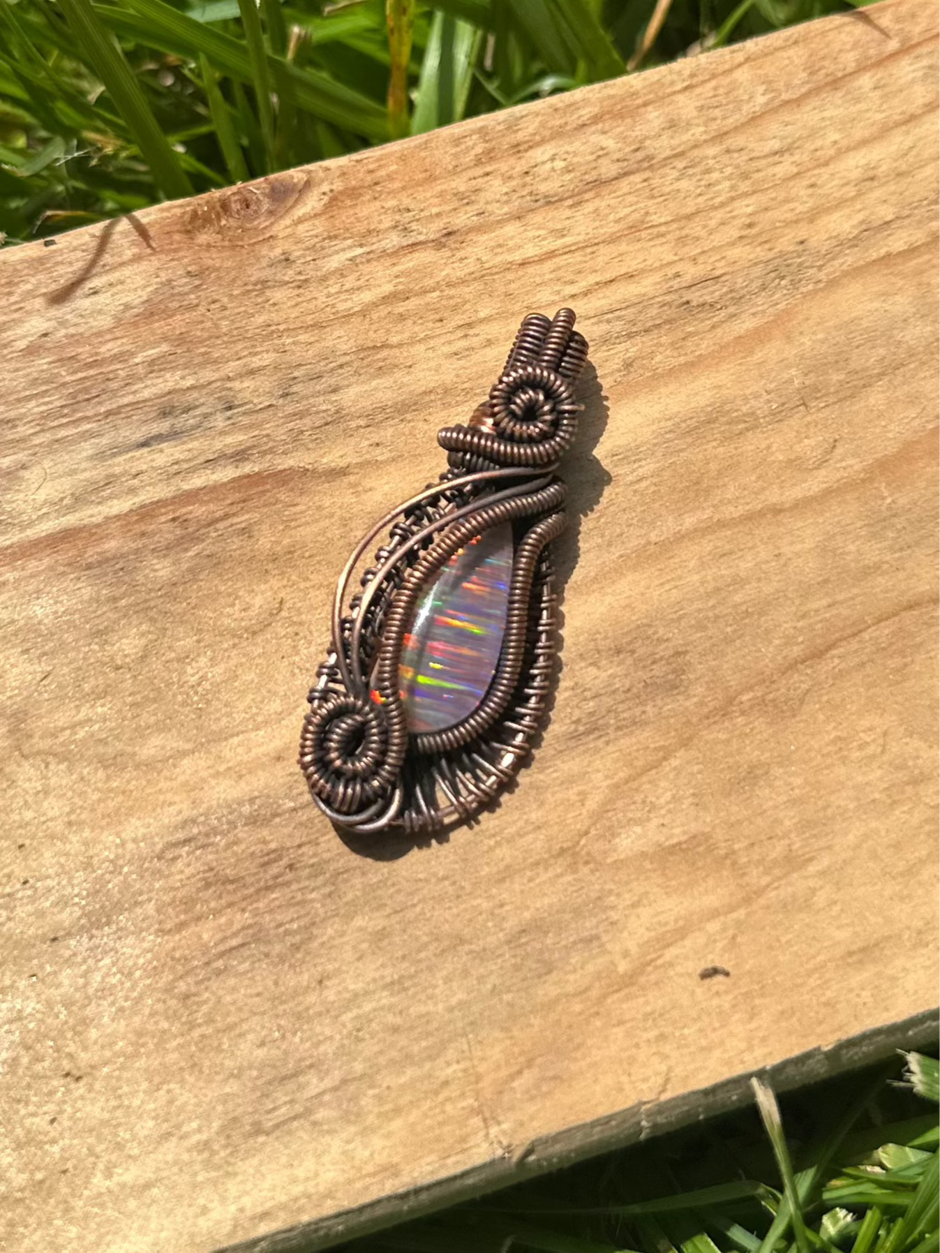Opal is the stone of abundance and hope. With rainbow highlights, it shines so divine under the sunlight. The Northern Lights "Opal" Pendant is hand-wrapped with high quality copper wire and oxidized to give that antiqued look.