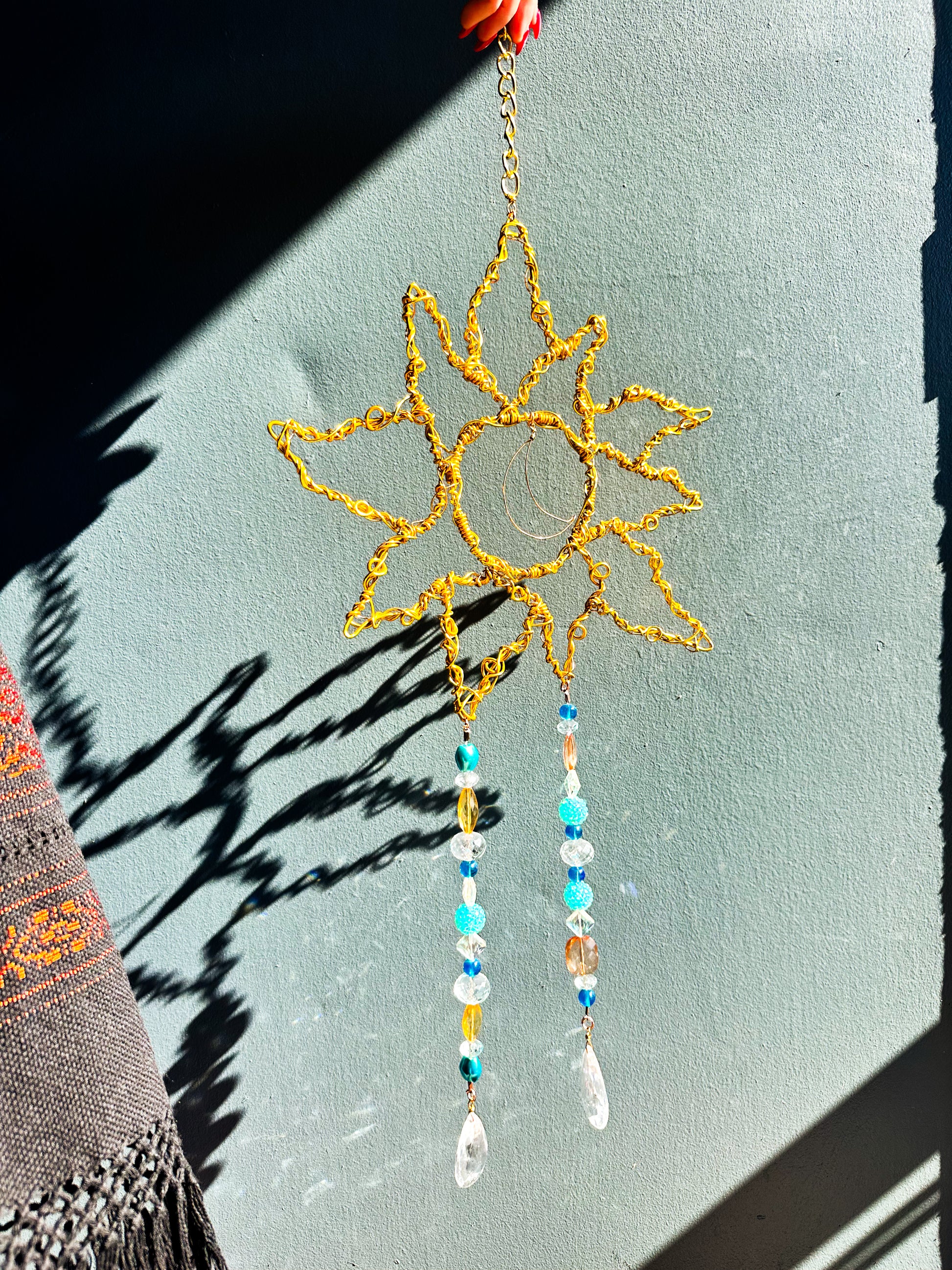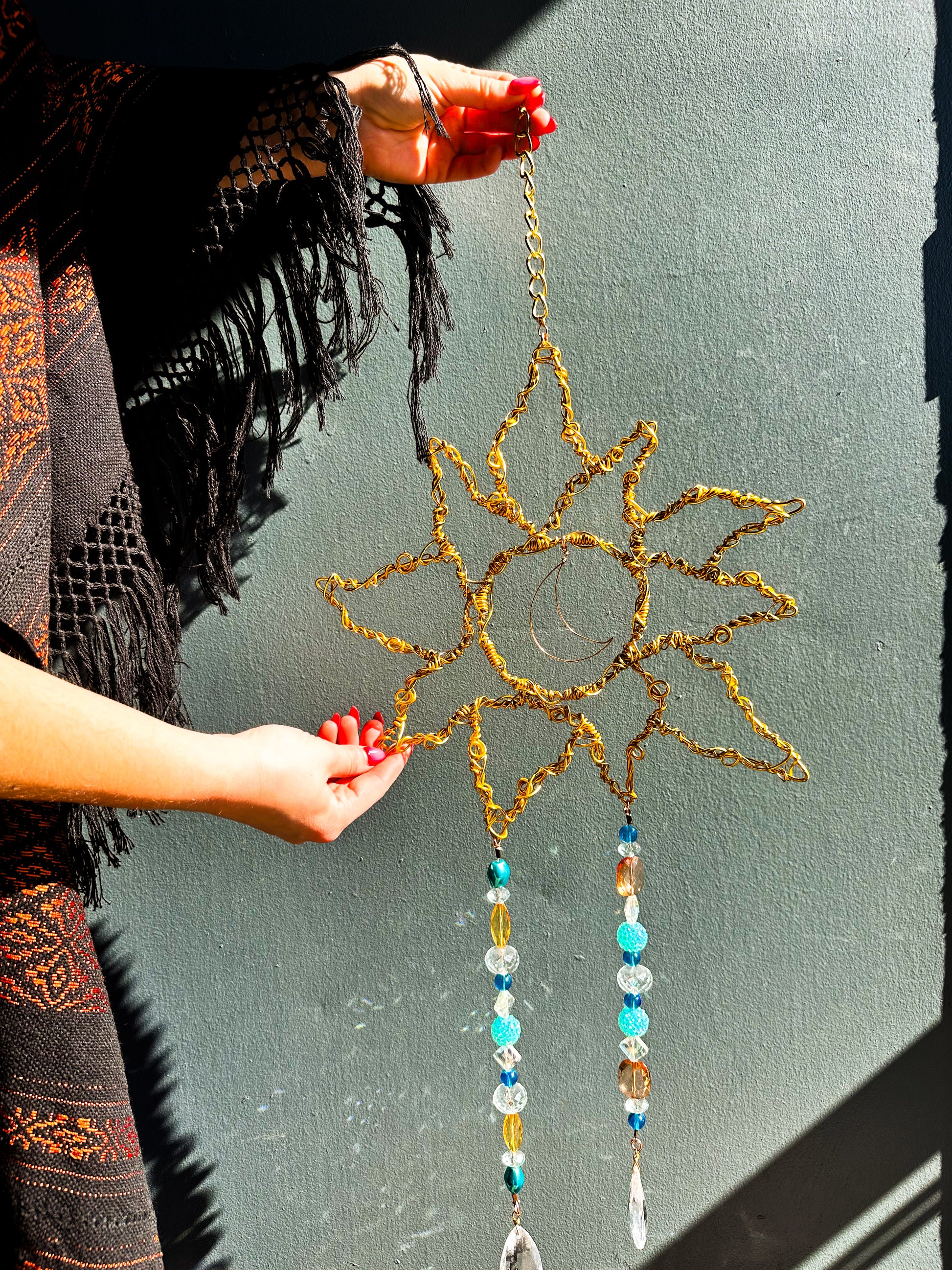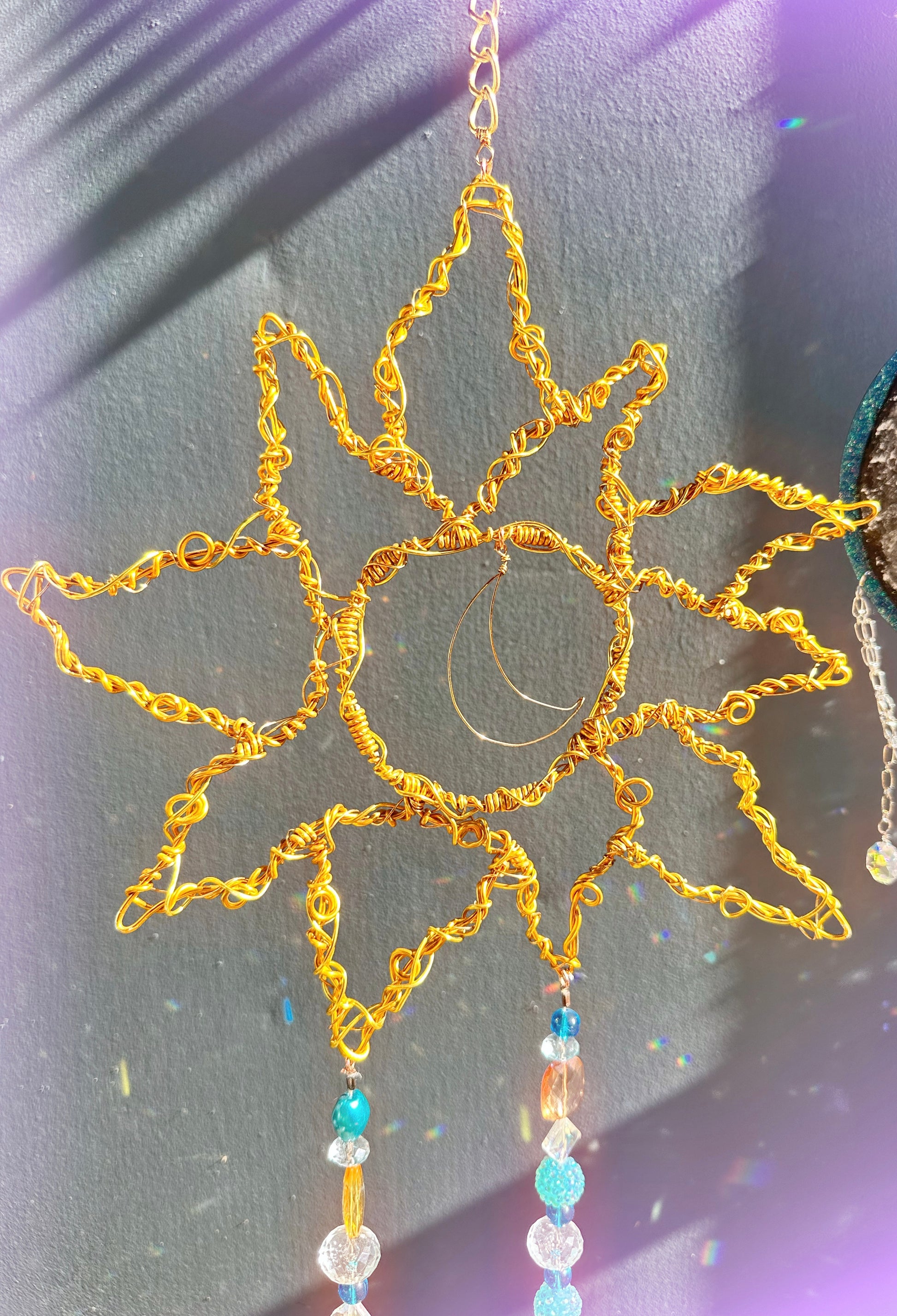 The "Ray of Sunshine" Suncatcher is made from gold wire and all hand wrapped. The suncatcher beads provide a beautiful cast of rainbows that shine mystically in the sun. This item weighs approximately 3.6 oz and the length is about 27.5 inches long and 11 inches wide.
