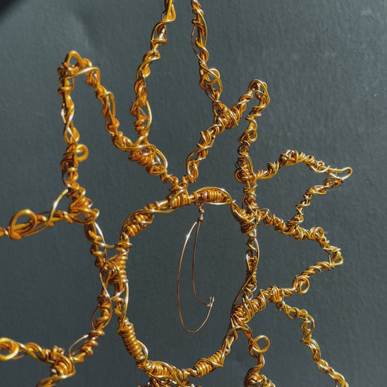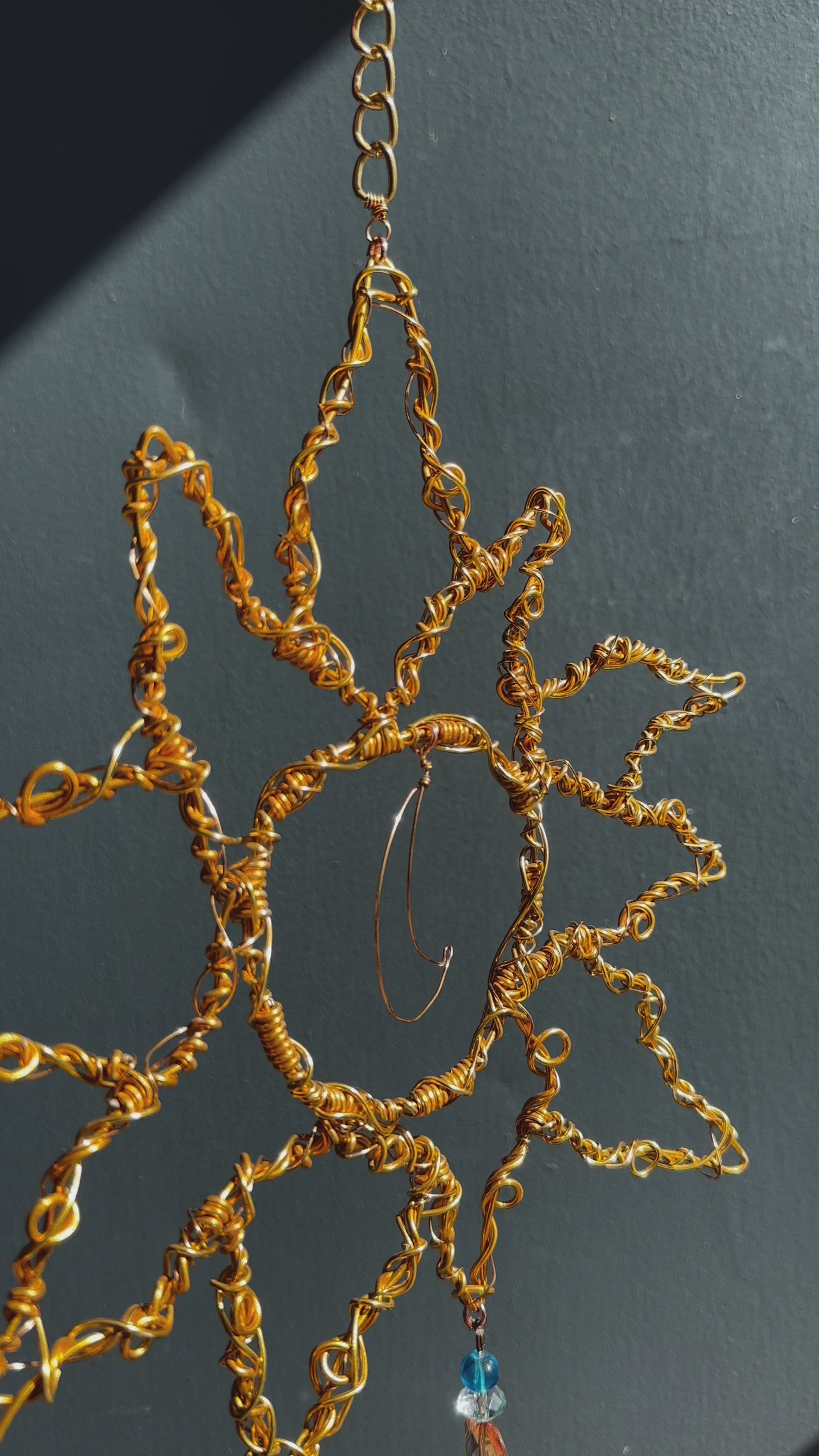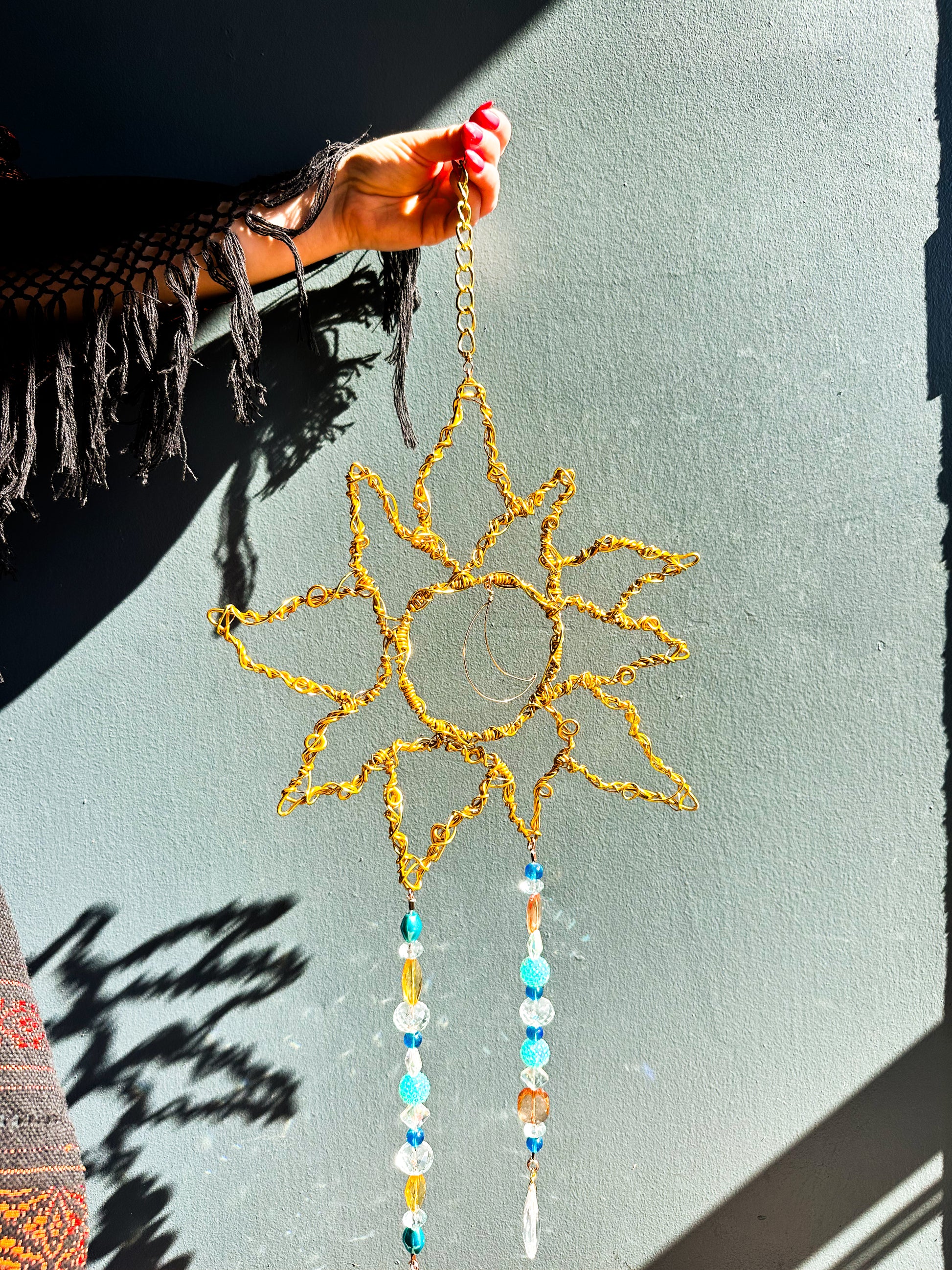 The "Ray of Sunshine" Suncatcher is made from gold wire and all hand wrapped. The suncatcher beads provide a beautiful cast of rainbows that shine mystically in the sun. This item weighs approximately 3.6 oz and the length is about 27.5 inches long and 11 inches wide.