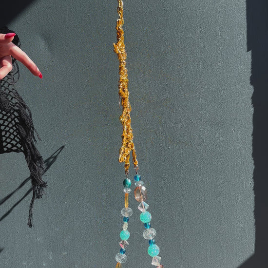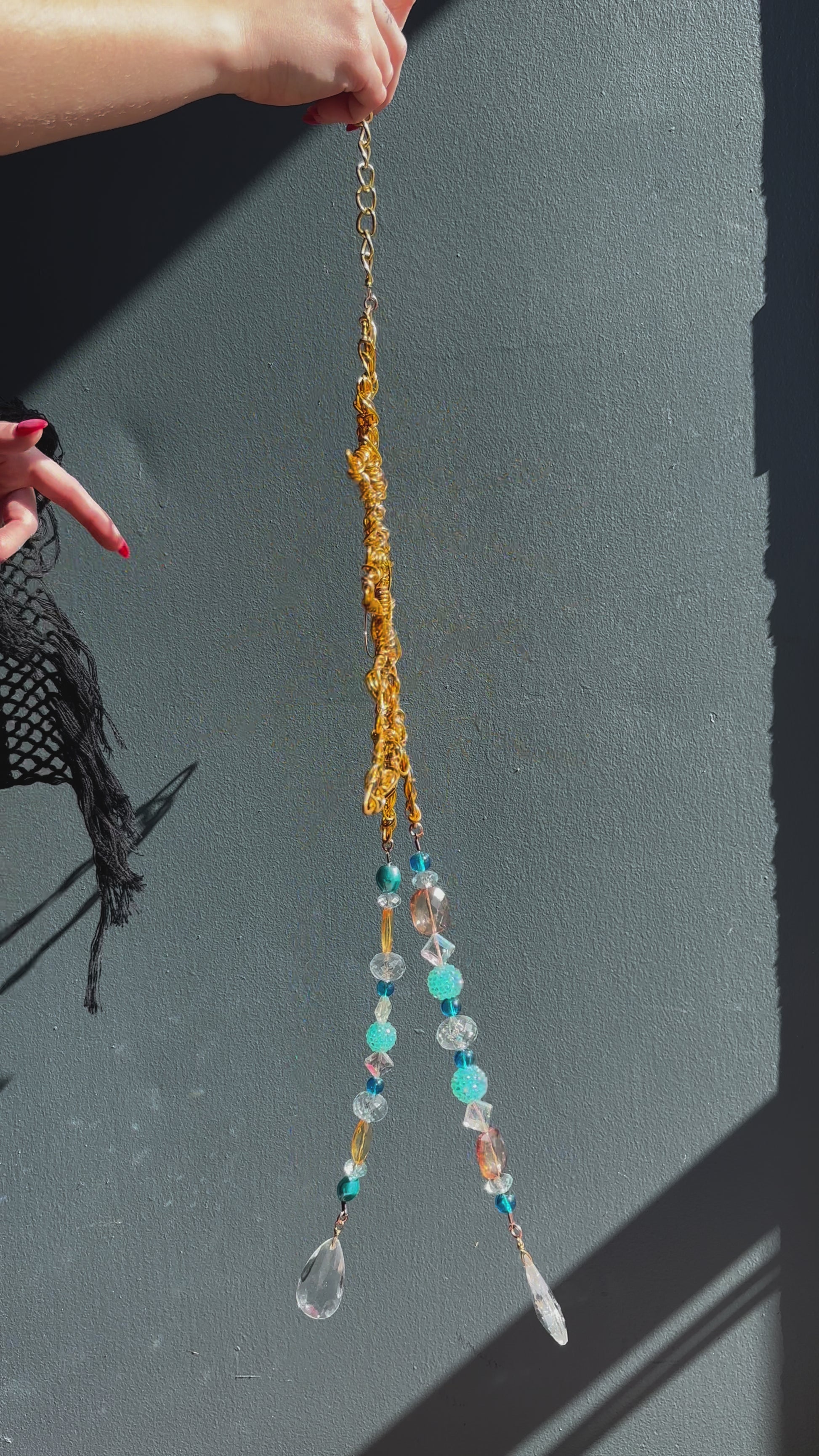 Materials used are gold plated chains, suncatcher beads, and gold wire.